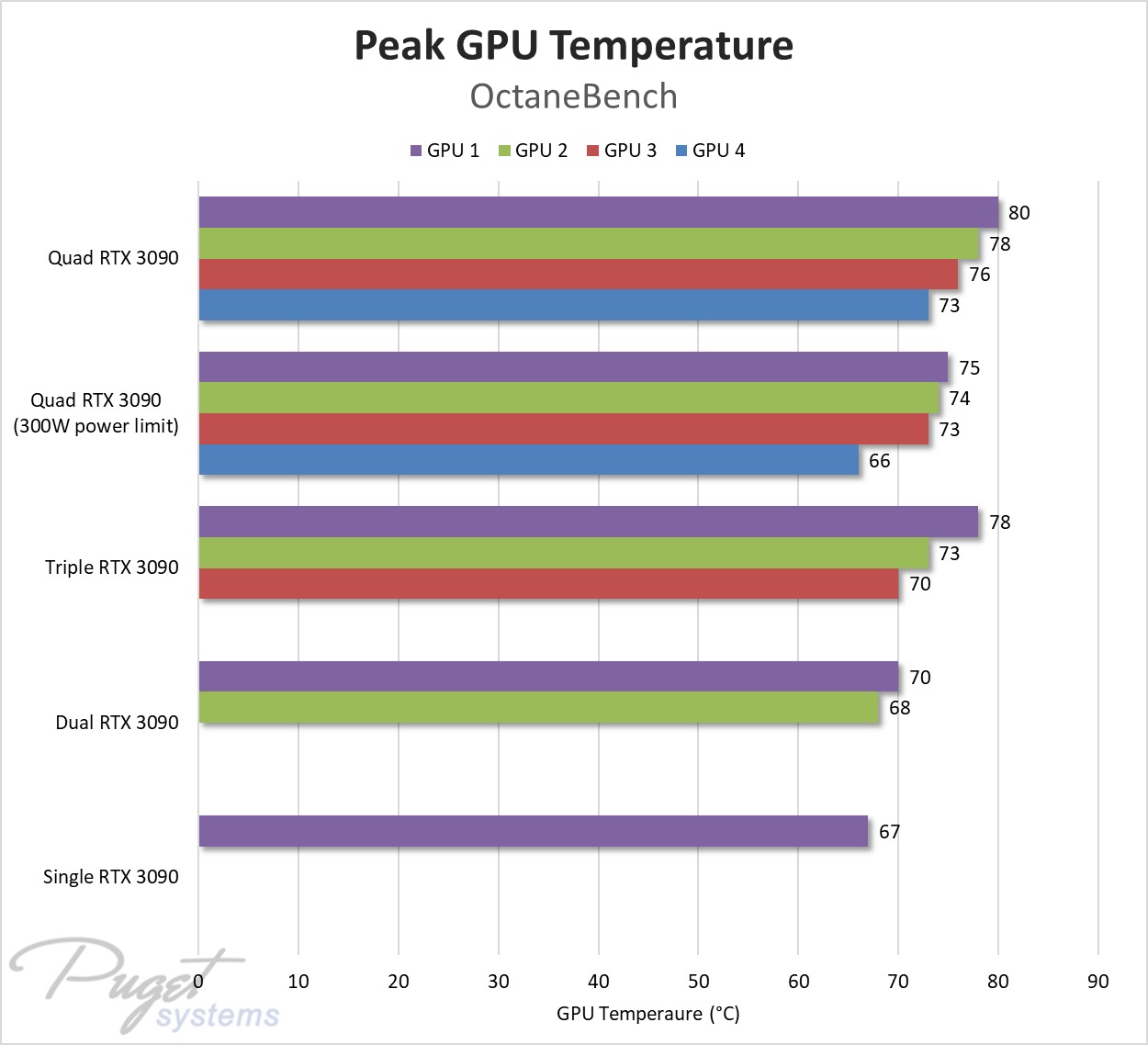 总体而言,我们发现,尽管Quad RTX 3090s能够使用单个1600W电源运行,但切割非常接近。请记住,这是从墙上汲取的功率,按照我们使用的EVGA单元的额定92%效率来计算,我们的峰值功率(1717瓦)应该仅在内部转换为1,580瓦。剩下整整20瓦!