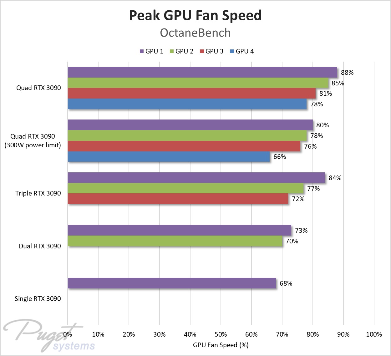在这种情况下,Quad RTX 3090s达到了最大风扇速度的88%的峰值。对我们来说,这已经开始使其关闭,但是从技术上讲,它应该有足够的净空-尤其是如果您使用额外的前部或侧面风扇来增强机箱冷却的话。