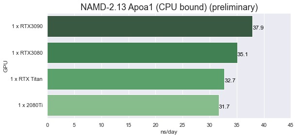 These Molecular Dynamics simulation tests with NAMD are almost surely CPU bound. There needs to be a balance between CPU and GPU. These GPU are so high performance that even the excellent 24-core Xeon 3265W is probably not enough. I will do testing using a a later time using AMD Threadripper platforms.