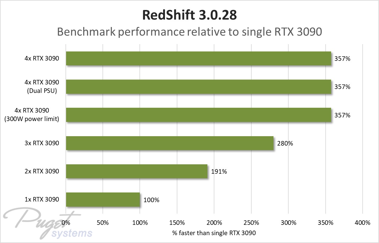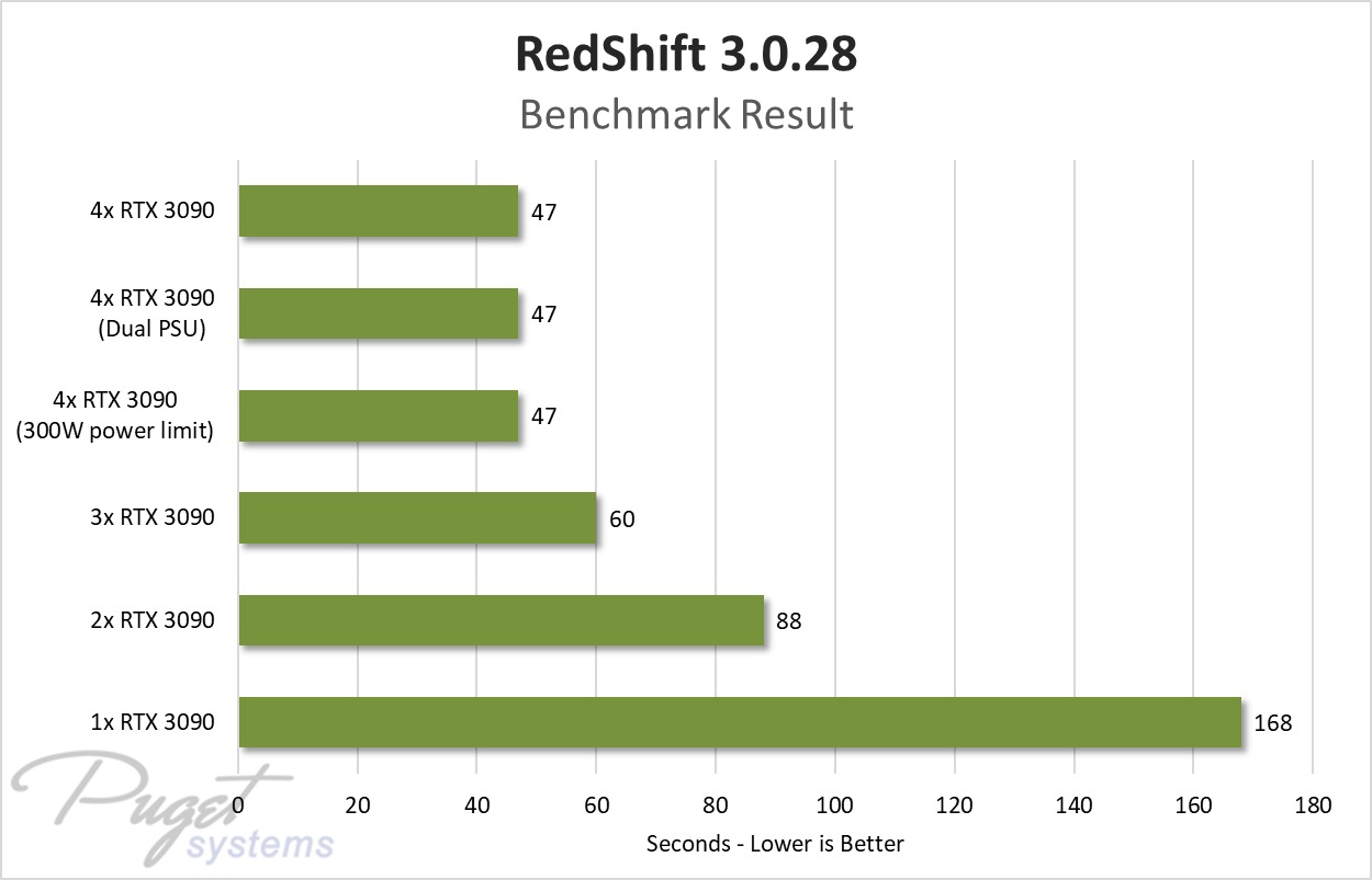 在RedShift中,我们没有看到很好的扩展性,但是四张RTX 3090卡仍然比单张卡快3.6倍。再一次,限制卡的电源并使用双电源不会在很大程度上影响性能。