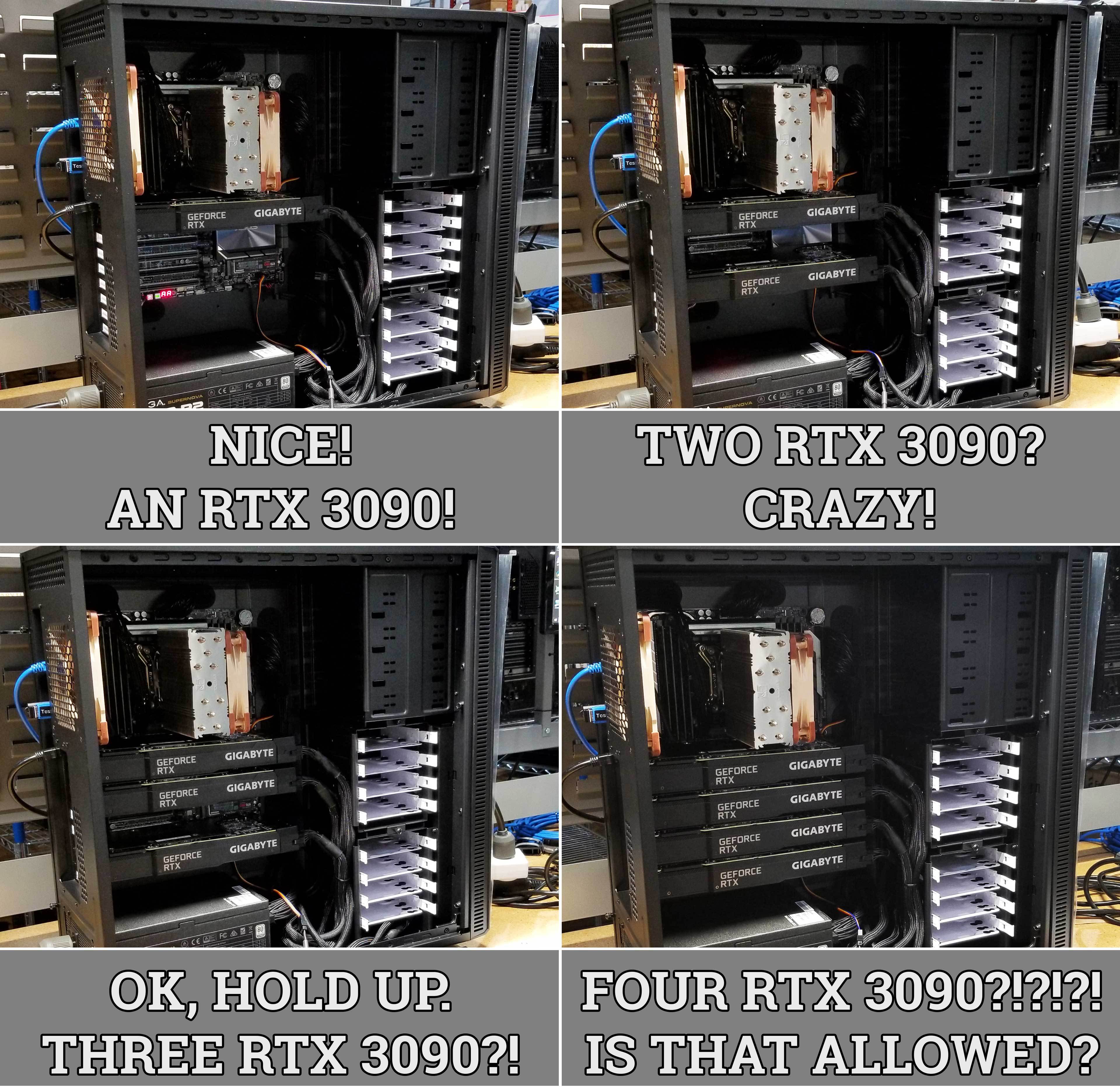 这就引出了一个问题:在台式工作站内安装四个RTX 3090是否切实可行?还是热量和功率消耗太多以至于无法处理?